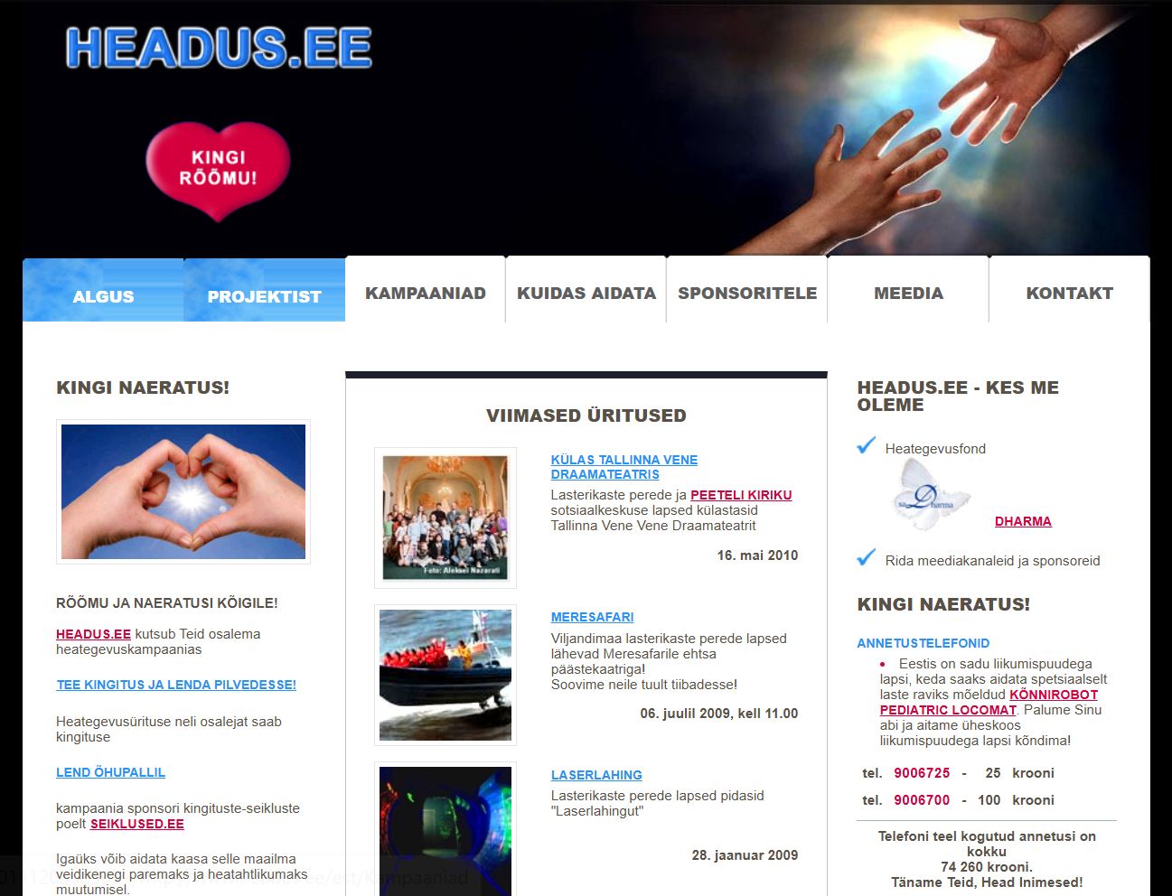 Проект Headus.ee был создан группой инициативных волонтёров в период 2008–2010 годов. В то время Headus.ee было проведено несколько благотворительных акций и социальных инициатив, направленных на помощь людям и развитие культуры взаимоподдержки в Эстонии.